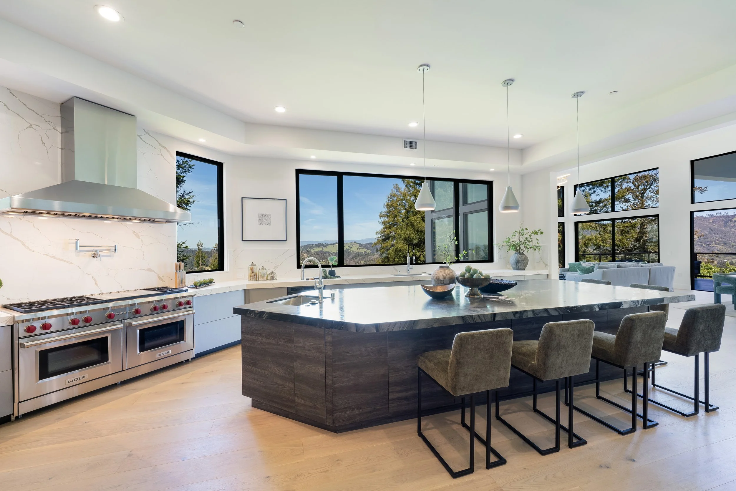 Modern kitchen with large island, barstools, stainless steel appliances, and large windows with a view.