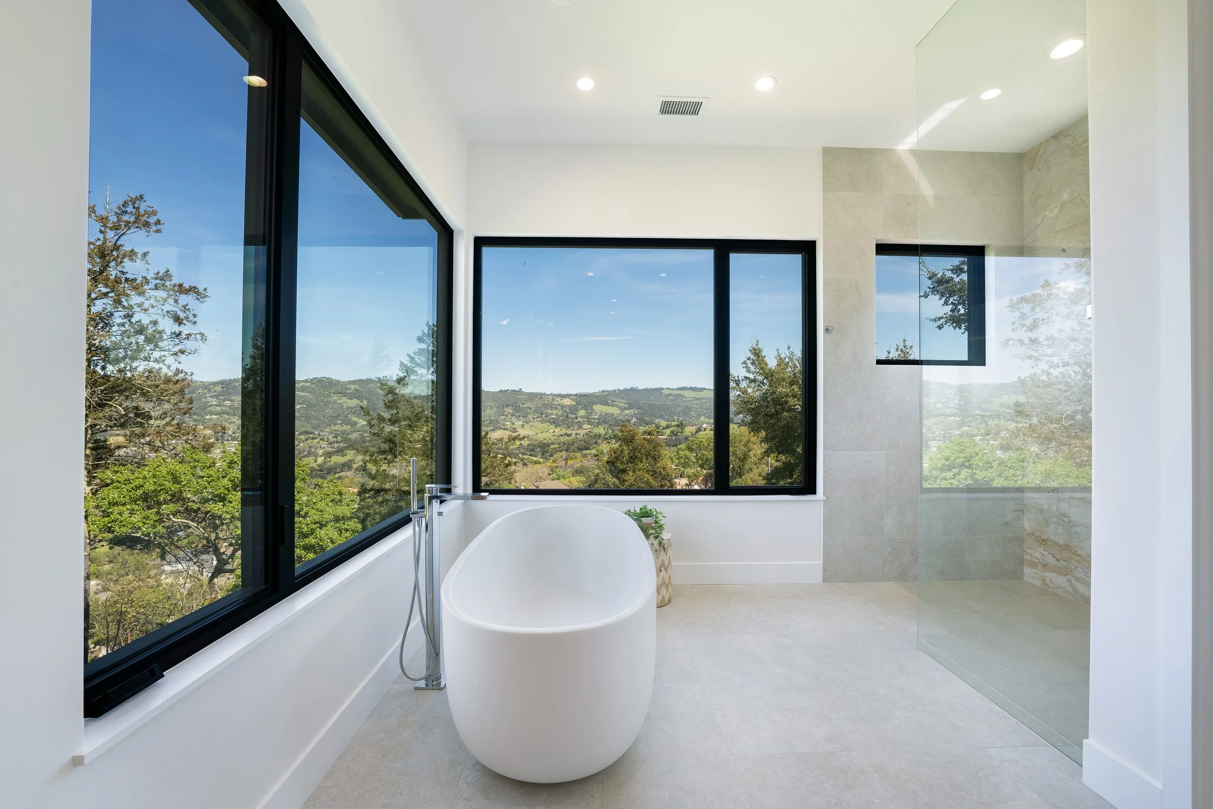 Modern bathroom with large windows, freestanding bathtub, and scenic view of greenery.