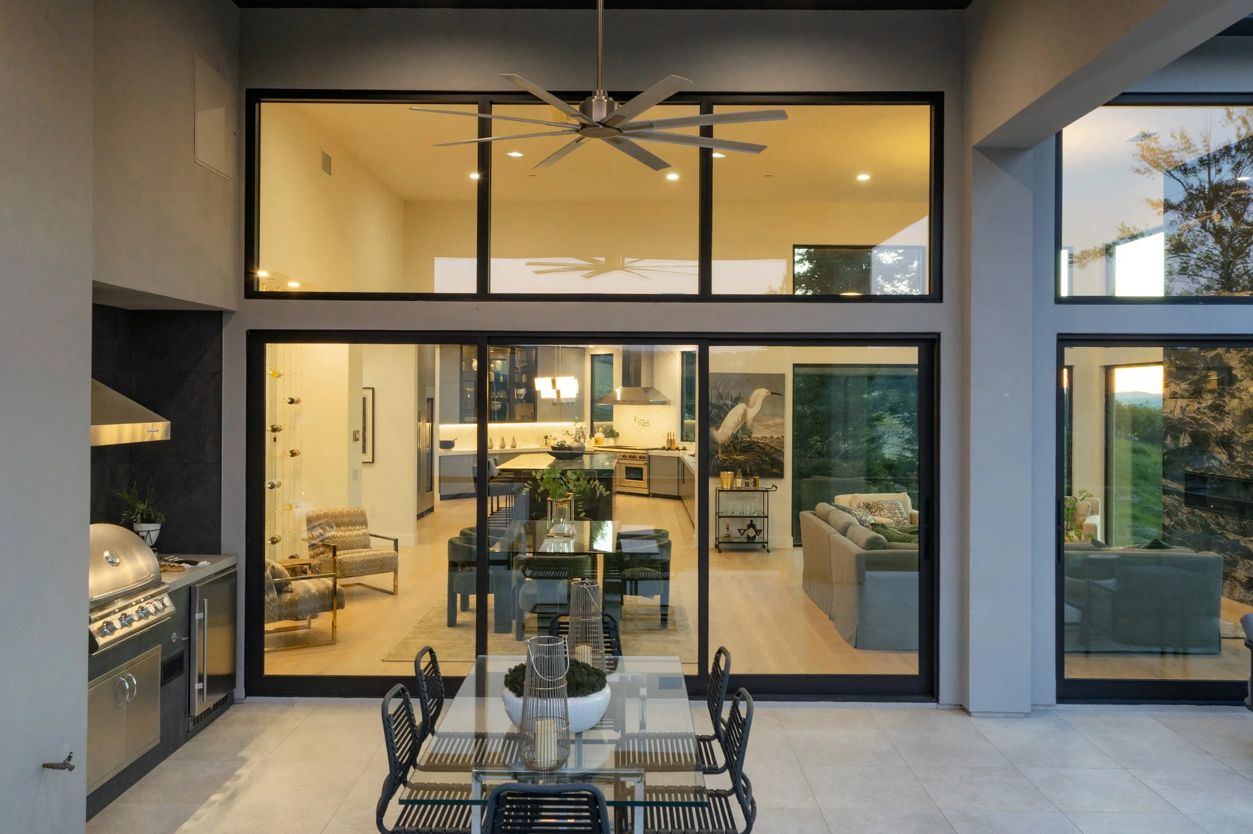 Modern outdoor patio with seating area, glass railing, and large sliding glass doors leading to an indoor space with dining area and kitchen. Ceiling fan and built-in grill visible.