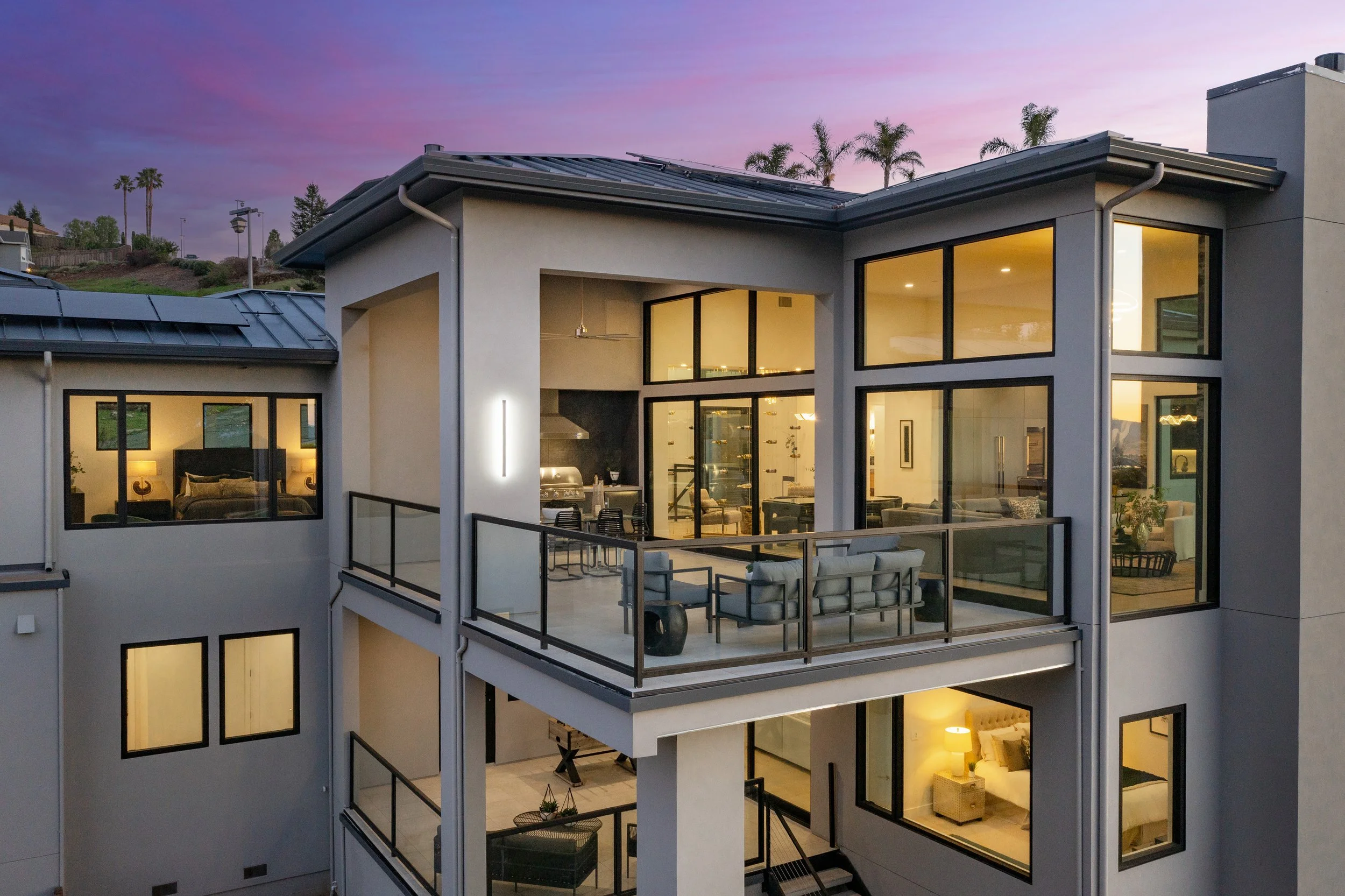 Modern house exterior with large glass windows and balcony at dusk, warm interior lighting, and surrounding hills.