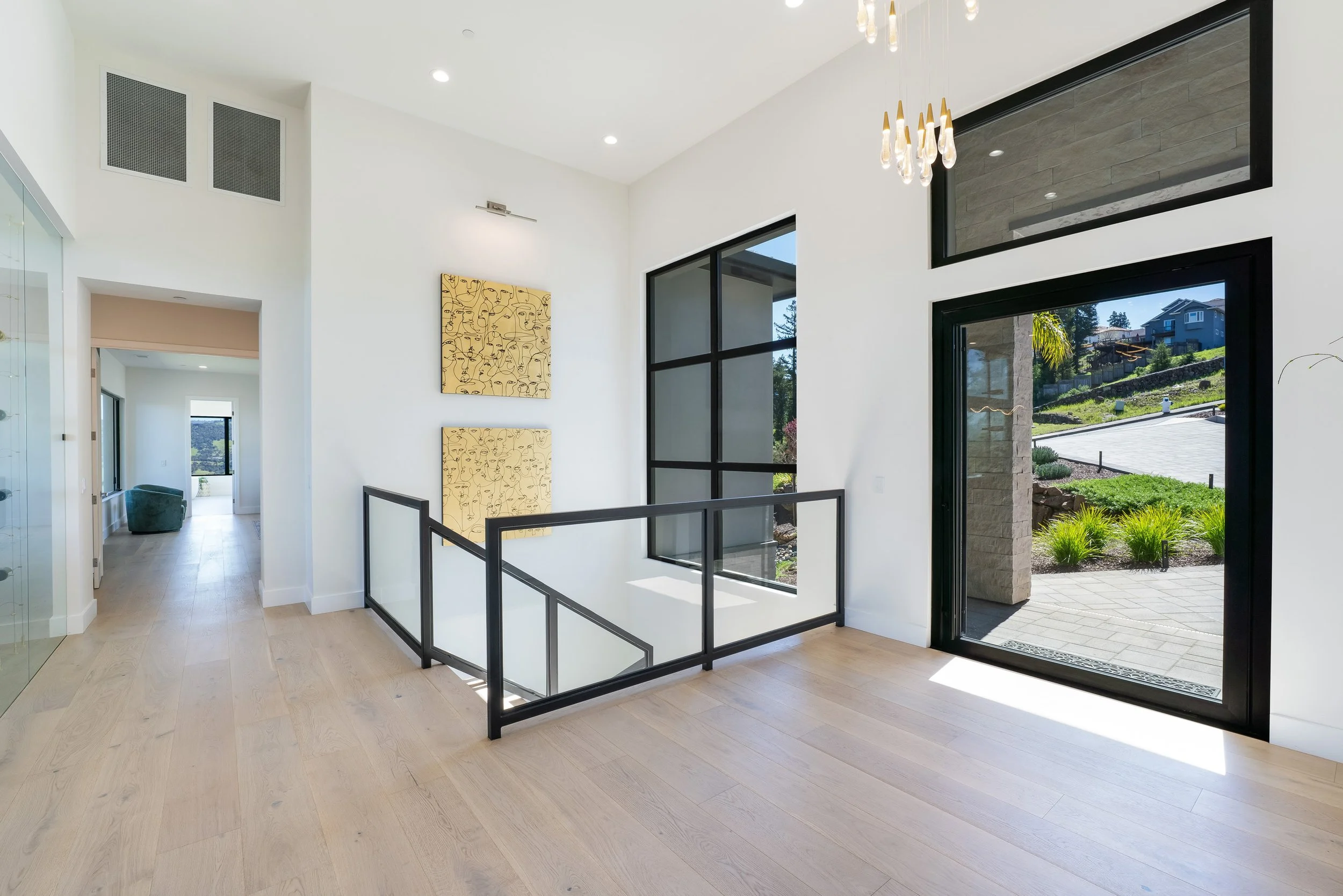 Modern and spacious home interior with wooden floors, a hallway leading to a living area, large windows, glass railing, and contemporary decor. Bright natural lighting and hanging light fixtures enhance the space.