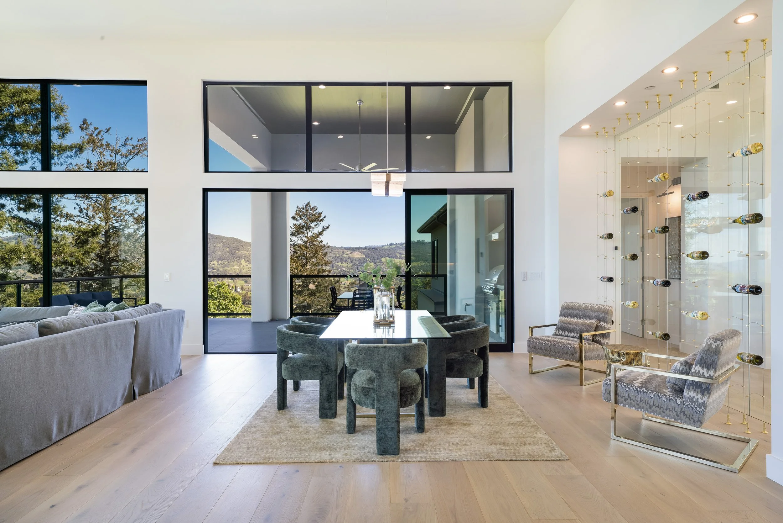 Modern living and dining area with large windows, glass dining table, plush gray chairs, wine rack, and outdoor view of trees and hills through sliding doors.